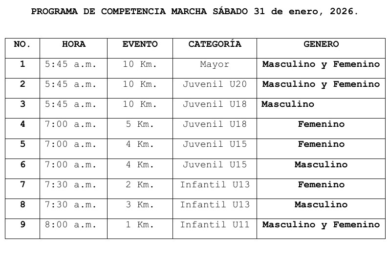 El evento reunirá a atletas de asociaciones departamentales y clubes de todo el país, quienes competirán en el Circuito certificado No. 2, un recorrido que garantiza condiciones óptimas para el alto rendimiento y la evaluación técnica de los marchistas.
