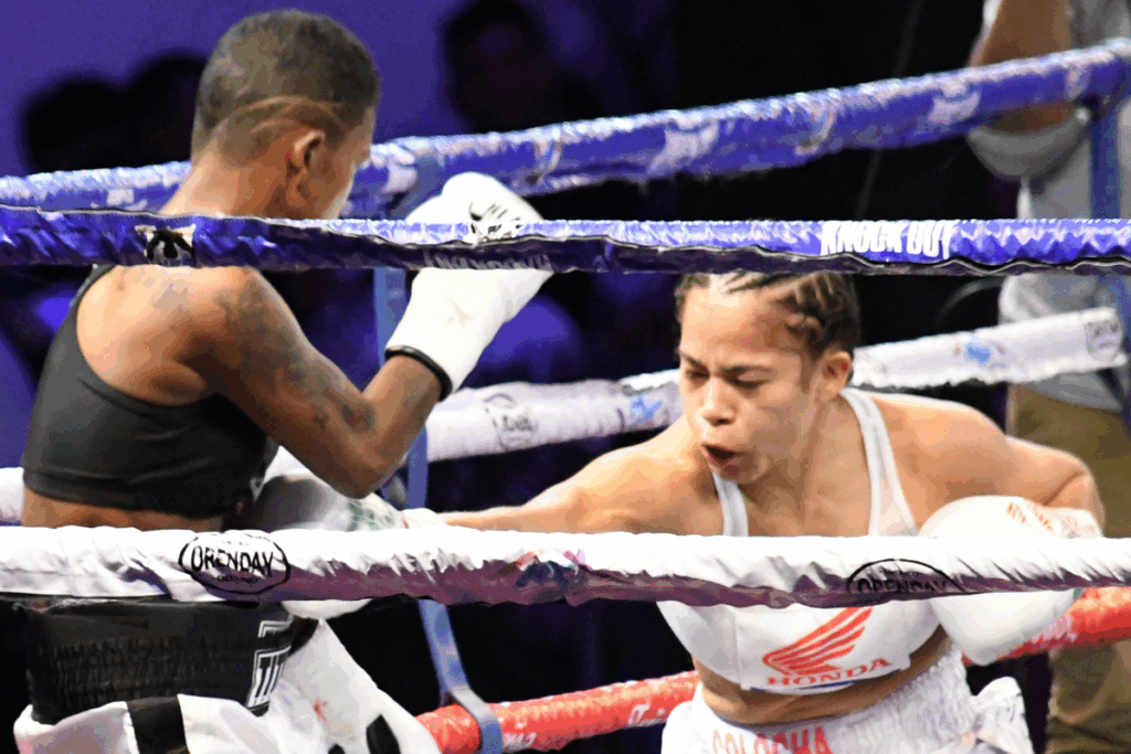 La pinolera Eveling la Colocha Ortega gana por la vía del nocaut a la colombiana Mayelis Altamar al 0:26 del tercer round y suma su victoria número 11.