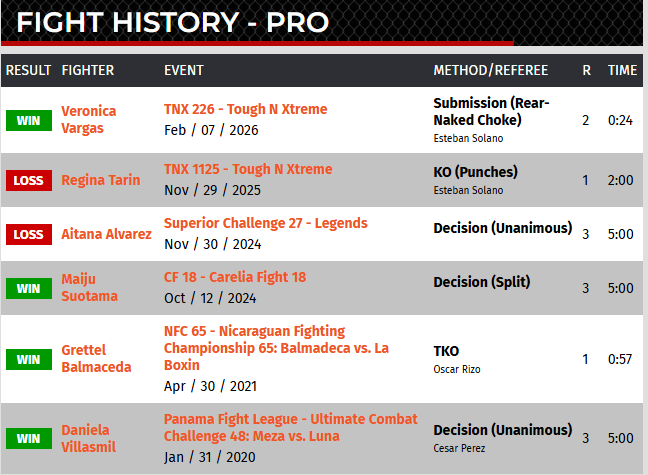 Hoy, su récord profesional en MMA es de 6-2, con derrotas ante una española y una mexicana zurda, ambas de amplia experiencia.